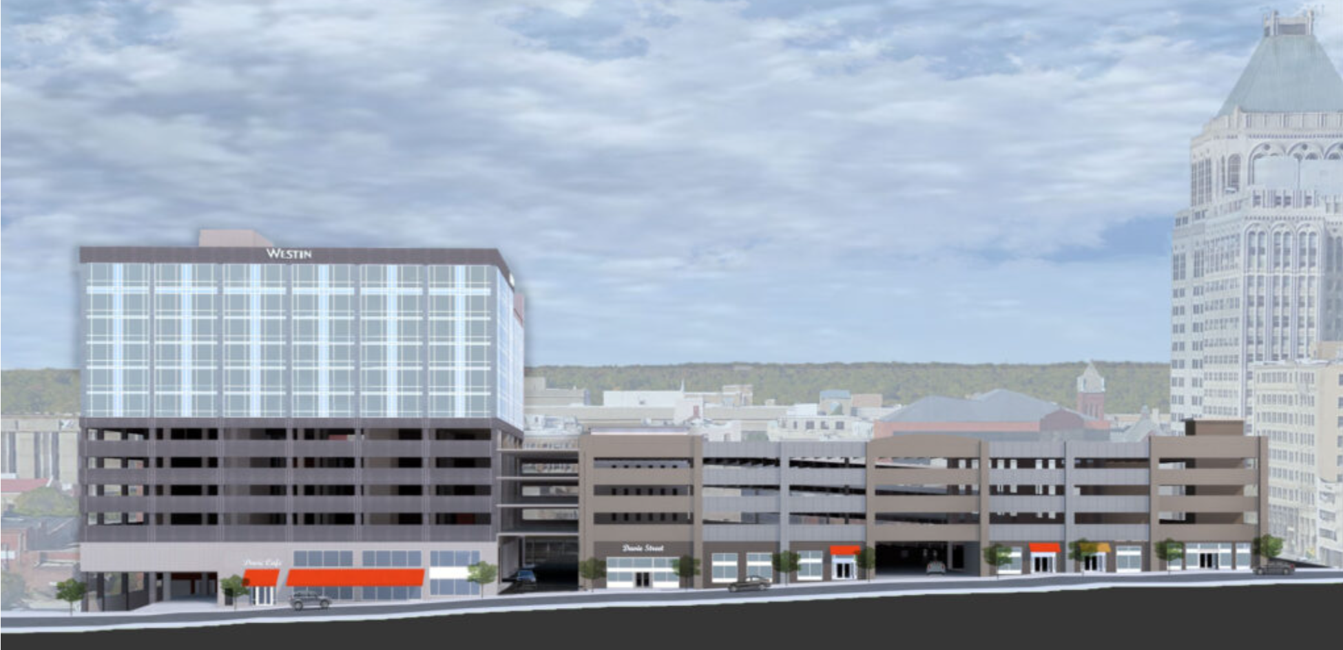 The new Westin Hotel will be located at 203 S. Elm St., adjacent to the February One parking deck, which was constructed to support the hotel. Scheduled to open in 2026, the hotel will feature 180 rooms, 22,000 square feet of event space, and 6,500 square feet of outdoor space, including a rooftop bar—a highlight for visitors and locals alike.